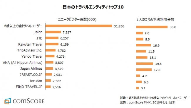 By browsing times, the top was ANA with 19.5 minutes a visitor on average, followed by JAL with 17.8 minutes and Rakuten Travel with 16.9 minutes.