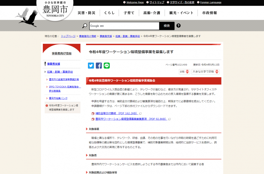 詳細:豊岡市役所「令和4年度ワーケーション環境整備事業を募集します」