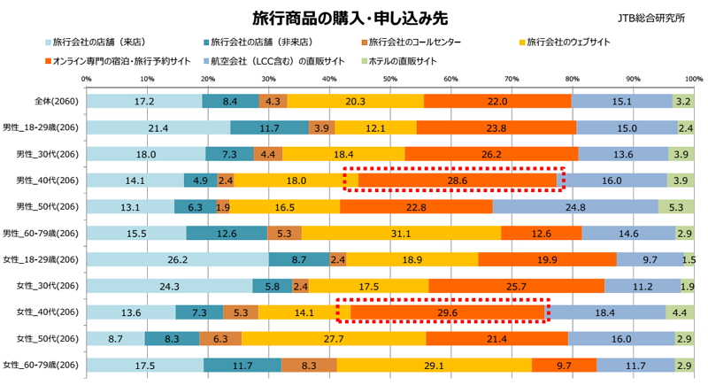 世代別でみると、20代以下の男女は約3分の1が「店舗(来店、非来店)」で購入しており、世代別でトップになった。40代はオンライン専門の予約サイトが約3割、60~70代は旅行会社のウェブサイトが約3割でそれぞれ最多となった。