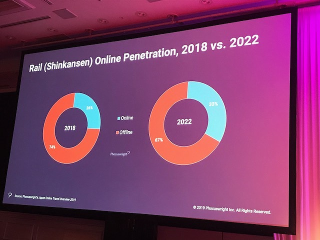 宿泊施設に関しては、中小規模の旅館を含む5万軒のオンライン販売比率は44%で、「およそ海外並みのネット率」と牛場氏。2022年には49%にまで上がり、全体のほぼ半数になると予想する。