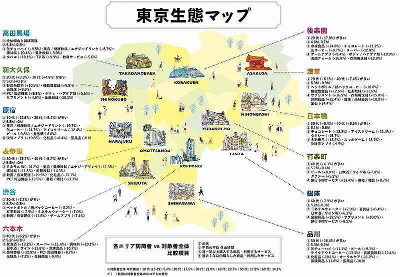 オンライン・オフラインを含めて購入/利用している商品/サービスのエリアごとの違いも判明。たとえば、40代が多いエリアでは、三越前で「金融商品・チョコレート・アイス・タクシー」、有楽町では「旅行サービス・ビール・日本酒/ワイン」、六本木では「発泡酒・スーパーマーケット・調味料・美容整形」、浅草では「ペットボトル/紙パックコーヒー・サプリメント・衣料用洗剤・機能性食品・保険商品」となった。