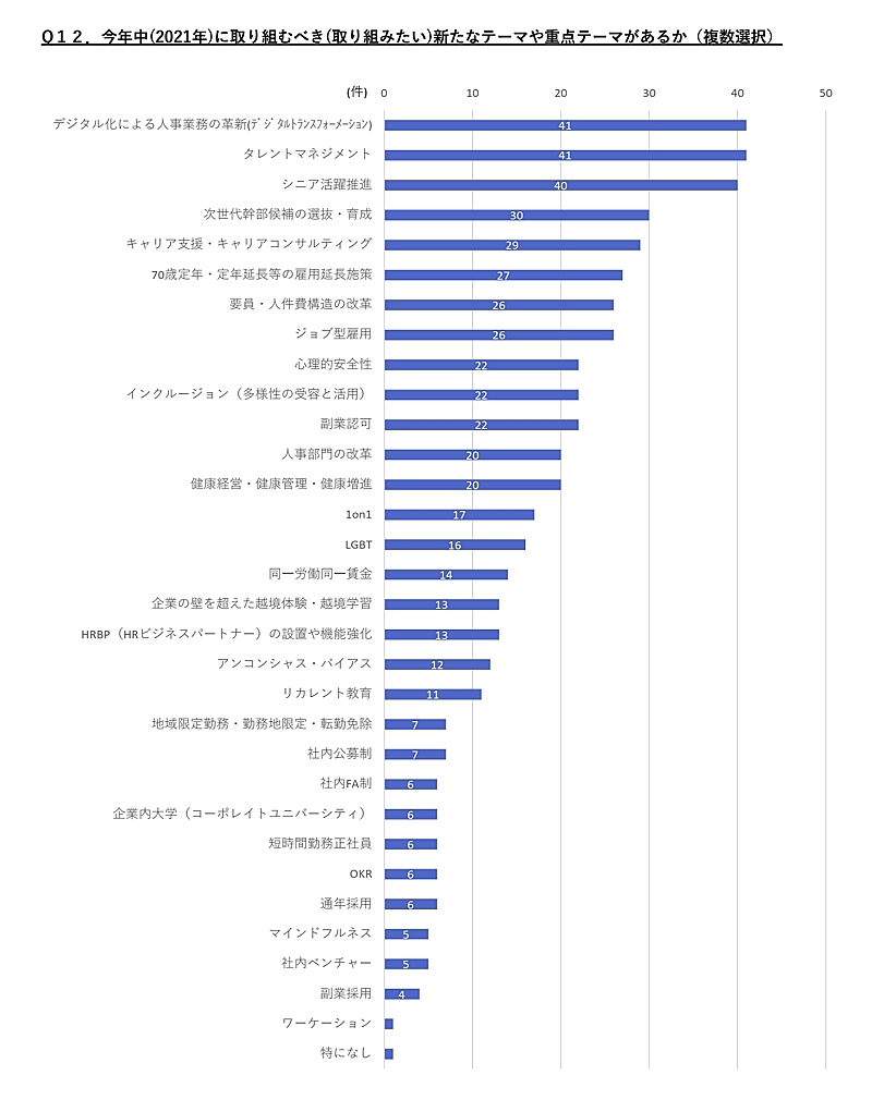 今年2月の調査では、「2021年中に取り組むべき(取り組みたい)新たなテーマや重点テーマ」として31項目が挙げられた。最も回答が多かったのは「デジタル化による人事業務の革新(デジタルトランスフォーメーション)」、「タレントマネジメント」と続き、「ワーケーション」は最も優先度が低い結果となった。