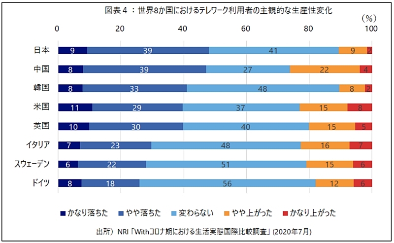 先ごろ、NRIは日本など8カ国(米国、英国、ドイツ、イタリア、スウェーデン、中国、韓国)でテレワーク(遠隔勤務)実態調査を実施。業務推進におけるコミュニケーションやメンタル面など課題はあるが、生産性は「変わらない」「上がった」との回答比率が8か国すべてで過半数を超えた。