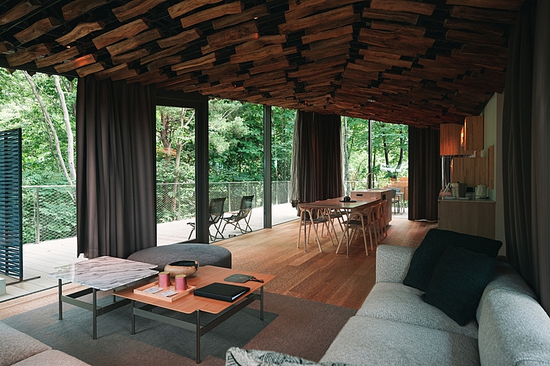 非キャンパー向けには、今年4月15日に本社敷地内に複合型リゾート「FIELD SUITE SPA HEADQUARTERS」がグランドオープンした。宿泊施設は、四方をガラス窓で囲まれ、広いデッキスペースには専用の外風呂を備えた「ビラ・スイート」が1棟、ひとまわり小さな「ビラ・ジュニア・スイート」が2棟のほか、スノーピークが隈研吾氏と共同開発したモバイルハウス「住箱」が4棟。