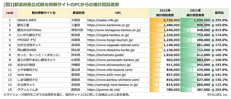 日本観光振興協会とネット行動分析サービスを提供するヴァリューズが共同で2022年の観光関連Webサイトの年間推計閲覧者数を調査を実施し、結果を発表した。それによると、多くの観光関連サイトの推計閲覧者数が前年比を上回っていることが分かった。