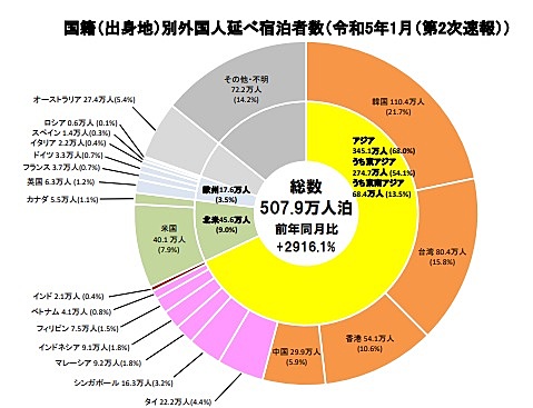 また、2023年1月の国籍(出身地)別外国人延べ宿泊者数は、1位が韓国、2位台湾、3位香港、4位米国、5位中国で、上位5カ国・地域で全体の62%を占めた。