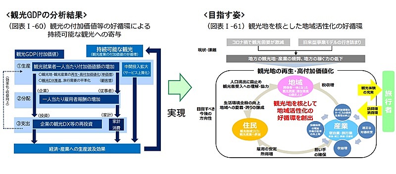観光白書ではこうした国際比較からも、「日本は観光の付加価値額や経済全体に占める割合が低位であり、『稼げる産業』への変革に向けて売上の増加(客単価×顧客数の増加)が取り組み課題になる」と指摘。そのうえで、観光サービスの生産において「稼ぐ力」を示す付加価値額をさらに強化することで、雇用者報酬への分配増加や観光DXをはじめ企業の再投資などの支出につながるとし、日本が目指す姿に「観光地を核とした地域活性化の好循環」を挙げた。
