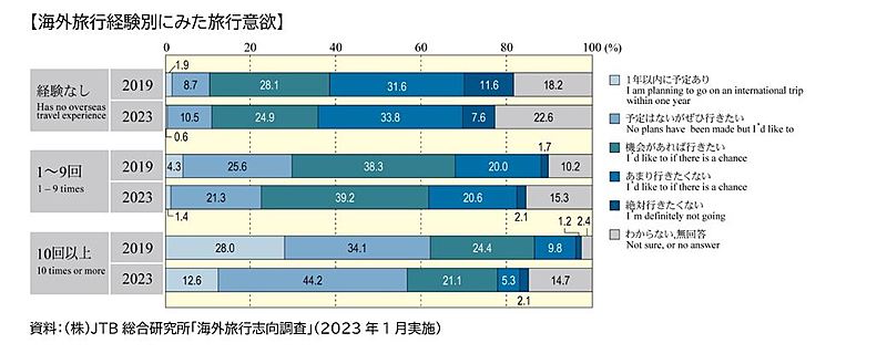 報道資料よりさらに、2019年時点の海外旅行経験別にみた旅行意欲と比較すると、具体的な旅行計画までは立てていないものの「予定はないがぜひ行きたい」人の割合は増加しており、「絶対行きたくない」「あまり行きたくない」人の割合も増えているわけではないため、今後のさらなる需要回復が期待されるとしている。