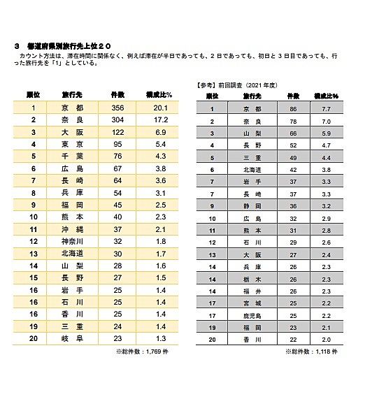 これによると、中学校828校のうち、計画通り実施したのは67.3%、出発日・日数・方面などを変更して実施したのは32.1%で、99%が2022年度中に実施した。国内修学旅行の実施時期は、国公立は5月に集中しており、10、11月が多かった2021年度から変化が見られた。私立は10、11月が多かった。行き先のトップ3は京都(シェア20.1%)、奈良(17.2%)、大阪(6.9%)で、山梨、長野、三重などにも分散していた2021年度に比べ、関西人気の復活が見られた。
