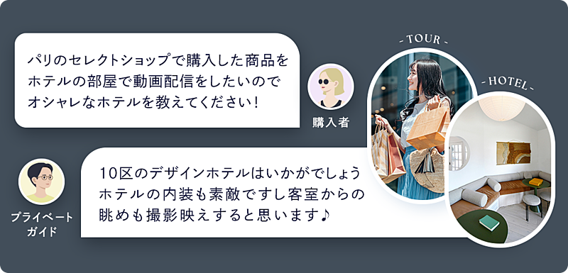 同サービスのツアー予約では、宿泊先は別途手配する必要があるが、これまで行きたい場所と宿泊場所のミスマッチが一部発生していたことから、宿泊相談機能の提供を始めた。この機能では、ツアーにぴったりのホテルを、プライベートガイドが提案する。