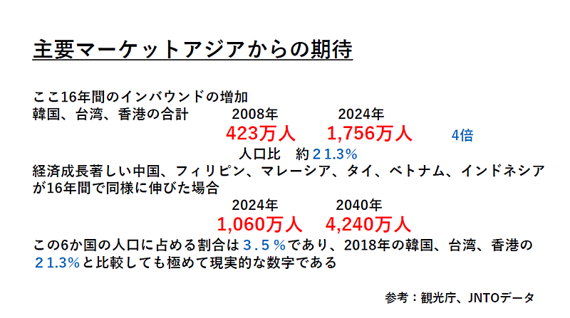 例えば、1つ目の「主要マーケット、アジアの経済成長とビザ緩和」。ここでいう、1億人時代の主要マーケットとは、経済成長率が高い中国とASEAN諸国だ。