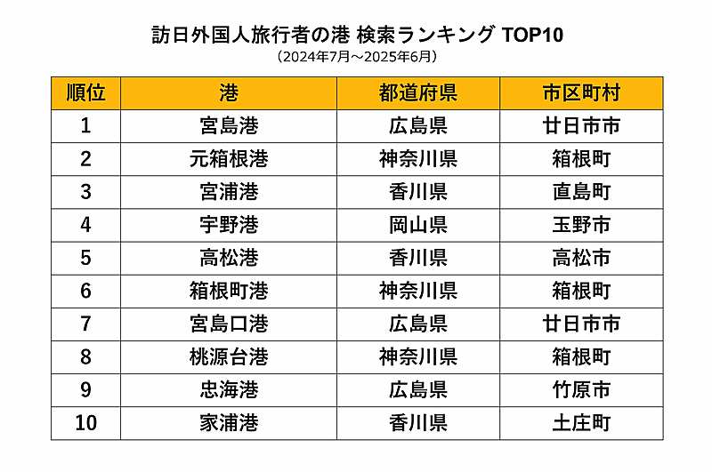 それによると、2024年7月1日~2025年6月30日の期間に、訪日外国人旅行者が目的地として検索した港のランキングでは、1位は廿日市の宮島港、2位は箱根町の元箱根港、3位は直島町の宮浦港となり、訪日外国人に人気のエリアが上位を占めた。