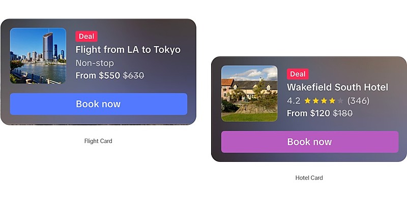 各トラベル広告には、ホテル名や評価、料金、フライト情報、割引などの関連情報が記載されたクリック可能な「旅行カード」が掲載される。「旅行カード」をクリックすると、ユーザーはカタログ内の関連商品リンクに遷移する。