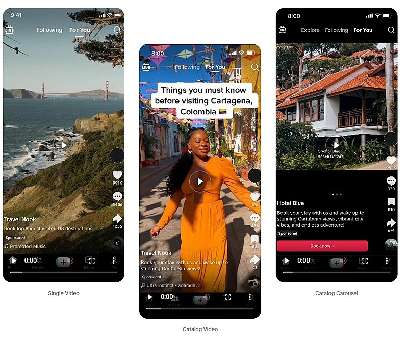動画系SNS「TikTok(ティックトック)」は、旅行関連の広告主向けに、新たにトラベル広告フォーマット(Travel Ads)をリリースする。新たなトラベル広告は、ホテル、航空会社、目的地(観光地)など旅行関連の広告主向けに特別に開発されたカタログベースのソリューション。パーソナライズされたクリエイティブを使用して、自動的にプロモーションを展開することが可能となる。
