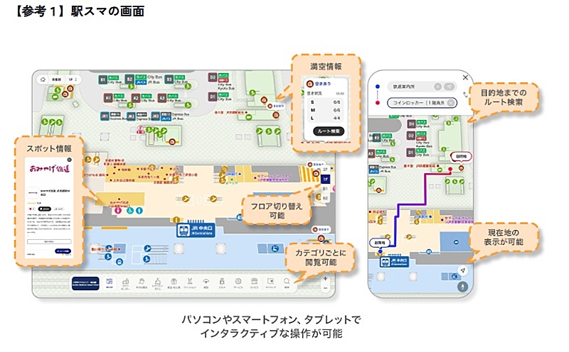 京都市と京都市観光協会(DMO KYOTO)はこのほど、京都駅構内のコインロッカーの位置・空き情報や、手荷物の配送・一時預かりサービス窓口、市バス乗り場や店舗情報などをオールインワンで提供するデジタルプラットフォーム「京都駅デジタルマップ~Kyoto Station Smart Navi~」(通称:駅スマ)を導入した。来訪者の利便性向上や手ぶら観光の促進、駅構内での目的地へのスムーズな誘導を図る。