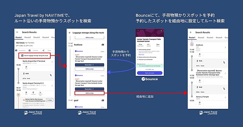 Bounce Japanとナビタイムジャパンは、手荷物預かり「Bounce(バウンス)」と訪日外国人観光客向けナビゲーションアプリ「Japan Travel by NAVITIME」の連携を開始する。Bounceが展開する手荷物預かりスポットのルート周辺検索、予約、予約したスポットの経由地追加、ナビゲーションが可能になり、訪日客の観光をサポートする。
