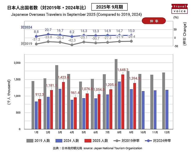 日本政府観光局(JNTO)によると、2025年9月の日本人出国者数(推計値)は、前年比15.0%増の139万4500人となった。