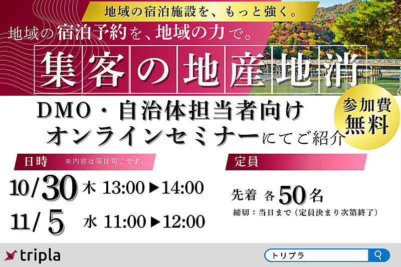 旅行業界向けIT・AIサービスを提供するトリプラ(tripla)は、2025年10月30日と11月5日にDMOや自治体、観光協会向けのオンラインセミナーを開催する。テーマは「地域主導で集客を加速する、宿泊・観光DXの進め方」。定員は各回先着50名、受講料は無料(事前登録制)。
