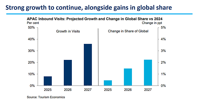 アジア太平洋地域(APAC)は世界の中でも回復が遅れた地域とされてきたが、現在は最も速い成長を遂げている。ショーリー氏は「APACのインバウンド旅行は2025年に前年比8%増と、世界平均の6%を上回る見通し」と指摘する。
