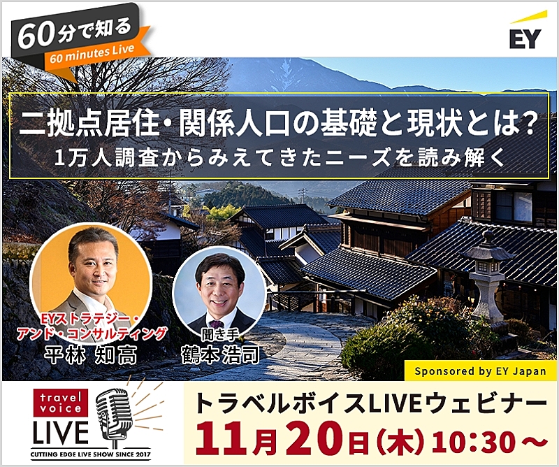 今回のトラベルボイスLIVEは、コンサルティングファームの世界BIG4の1つ、EY Japanと共同で開催。地方自治体や地域が注力している関係人口の創出、とりわけ二拠点/多拠点居住の拡大に向け、域外の人と地域との関係性の深め方や、観光が担う役割の重要性を考える。