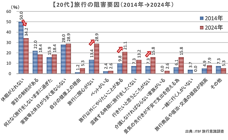 一方で、2014年はあまり存在感のなかった「旅行に関心がない」「旅行以外にやりたいことがある」「行きたいと思うところがない」といった阻害要因が、2024年には上昇しています。