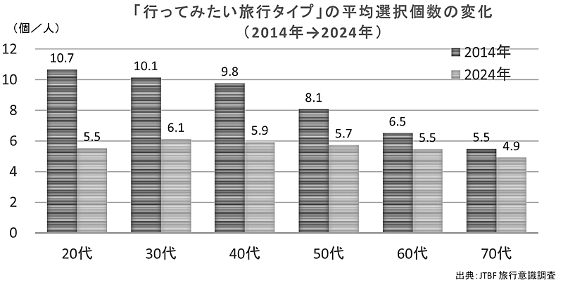 10年前は、若年層ほど「行ってみたい旅行」タイプがたくさんあり、それが年代の上昇とともに減少する傾向にありましたが、現在では、若年層も高齢者も、旅行における興味・関心の幅はそれほど変わらないようです。