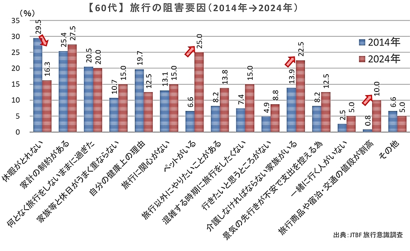 一方、2014年には1割にも満たなかった「ペットがいる」や、1割強だった「介護しなければならない家族がいる」という阻害要因が大きく増加し、2024年には全体の中でそれぞれ2位・3位になりました。加えて、2014年はほとんど選択されていなかった「旅行商品や宿泊・交通の値段が割高」という阻害要因も上昇しています。