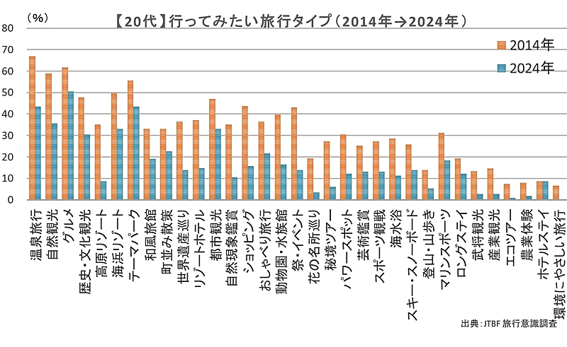 20代の旅行に対する意向の低下について、同じ「JTBF旅行意識調査」で把握している「行ってみたい旅行タイプ」からも深堀してみます。これは、図5にあるとおり、約30個の旅行タイプについて、それぞれの実施意向を尋ねたものです。20代の「行ってみたい旅行タイプ」をみると、2014年から2024年にかけて、ほとんどの旅行タイプが減少しています。
