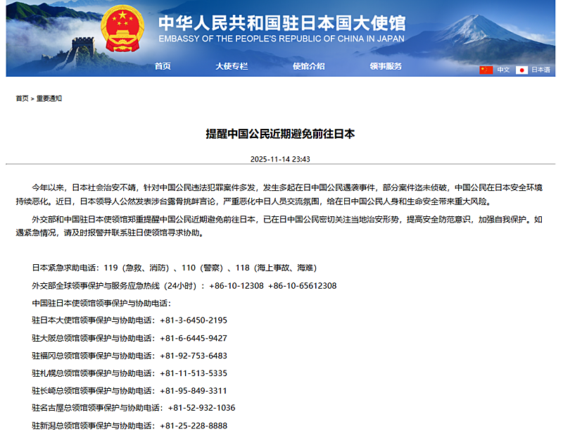 中国政府は、2025年11月14日、自国民に対して日本への渡航を控えるよう呼びかけた。高市首相の台湾有事をめぐる発言を受け、両国関係の悪化を理由にしている。