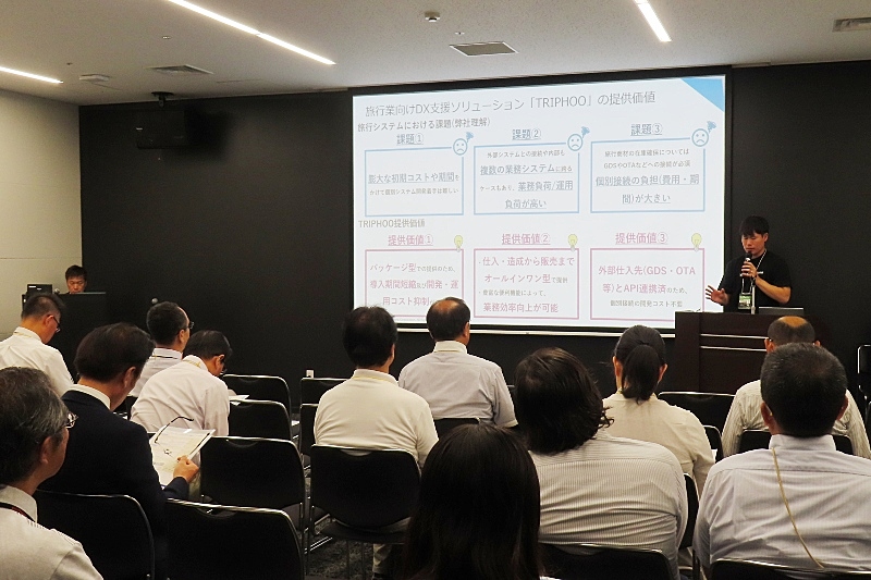最初に紹介したのは、旅行業向けDX支援ソリューション「TRIPHOO」だ。登壇した同社旅行業DXコンサルタントの永井洵伎氏は、旅行会社のシステム導入の課題として、高コスト、複数システム連携の非効率、GDSやOTAと接続する負担などを指摘。これらを解決するオールインワン型ソリューションとして開発したのが、TRIPHOOであると説明した。