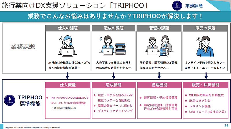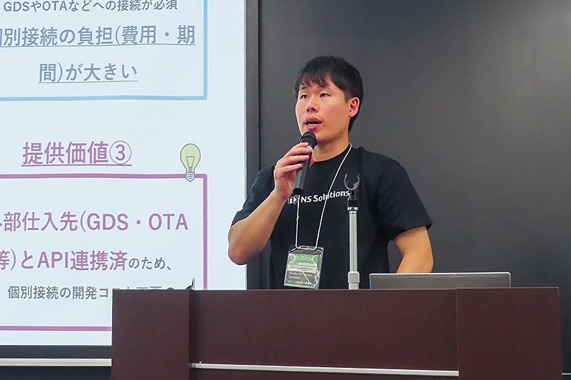 日鉄ソリューションズ 旅行業DXコンサルタント 永井洵伎氏TRIPHOOは旅行会社が販売する商品について、仕入れから造成、販売、管理まで一元的にサポートするサービス。仕入れでは主要GDSやOTA、サイトコントローラーなどと標準接続し、従来、数カ月・数千万円のコストが必要だった接続作業を不要にする。また、標準接続によって、仕入れ先を拡大することも可能だ。
