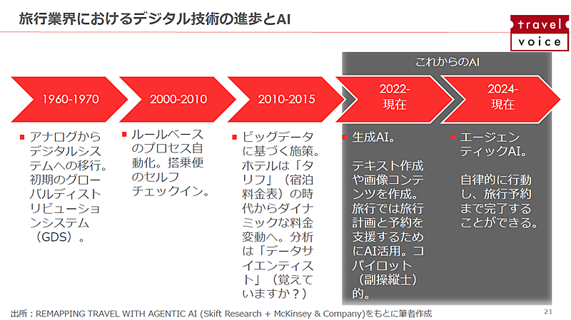 さらに、テクノロジーが旅行業に与えてきた影響を、歴史的に整理。1960〜70年代にはGDSの登場で、航空旅客流通がアナログからデジタルと大転換した。2000年頃には、各種の旅客輸送プロセスの自動化によって、セルフチェックインが登場。2010年代にはビッグデータ活用が進み、ダイナミックプライシングが主流になった。そして、ChatGPTが登場した2022年以降、進化の焦点は生成AIへと移っている。
