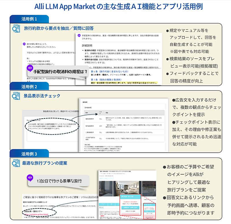 旅行業務で活用できるアプリも多い。例えば、過去の仕入れ案件の比較や予約傾向の可視化、法令・規制に関するチェックポイント表示など。旅行契約に関する問い合わせがあった際には、旅行約款から必要な情報を抽出・要約することもできる。