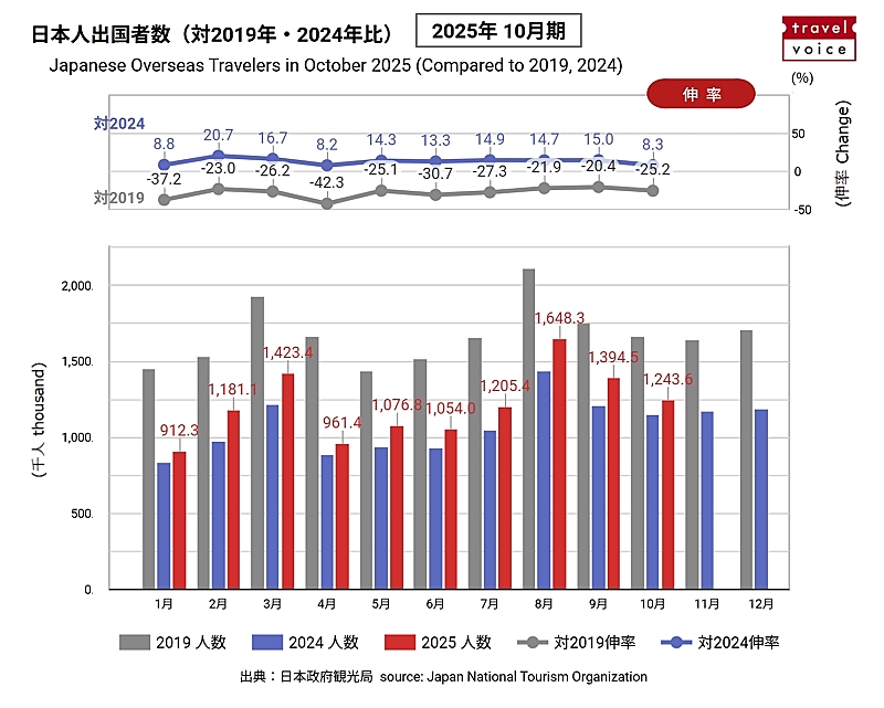 日本政府観光局(JNTO)によると、2025年10月の日本人出国者数(推計値)は、前年比8.3%増の124万3600人となった。今年は5月以降、前年比14%前後の推移が続いていたが、10月は再び1ケタ増にとどまった。