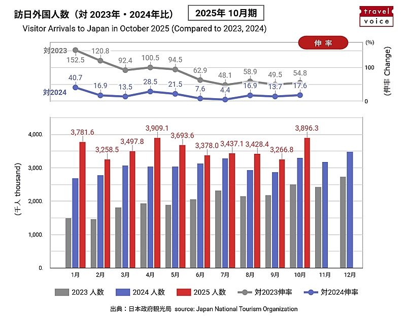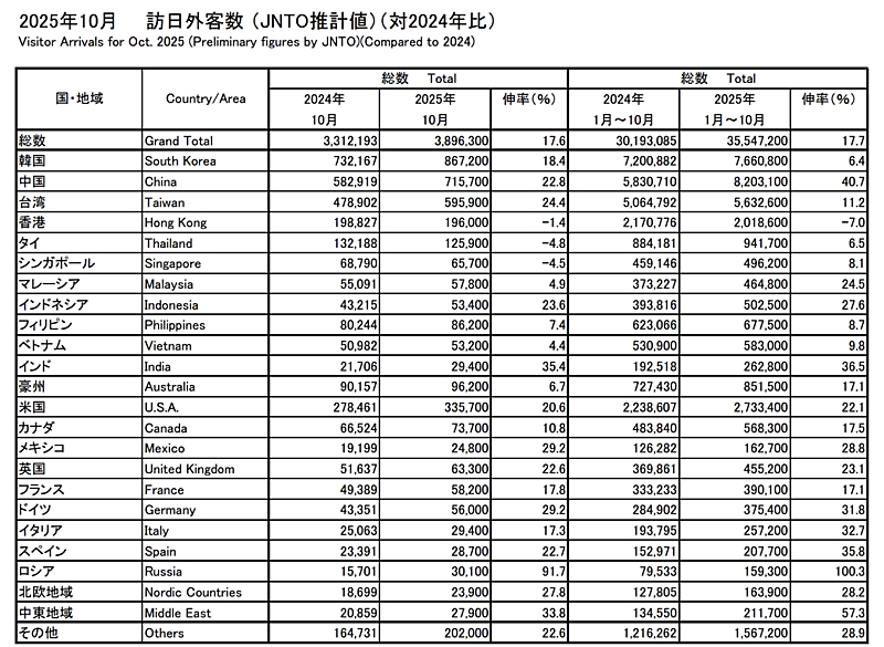 日本政府観光局(JNTO)によると、2025年10月の訪日外国人旅行者数(推計値)は前年比17.6%増の389万6300人となった。10月としては昨年の331万2193人が過去最高だったが、それを58万人以上、上回る大幅な更新となった。2023年10月(実数:251万6623人)との比較では、54.8%増。