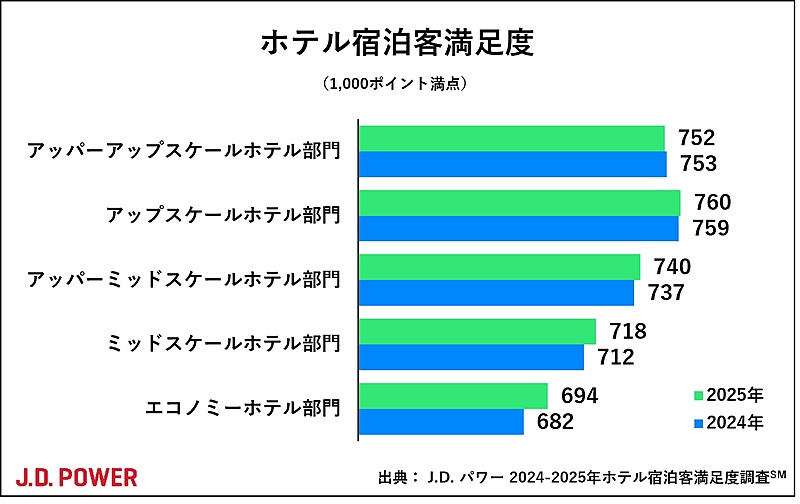 J.D. パワーは合わせて2025年ホテル宿泊客満足度ランキングを発表した。各ホテルの最多客室面積帯を基に5部門に分けて測定、1000ポイントを満点として算出している。