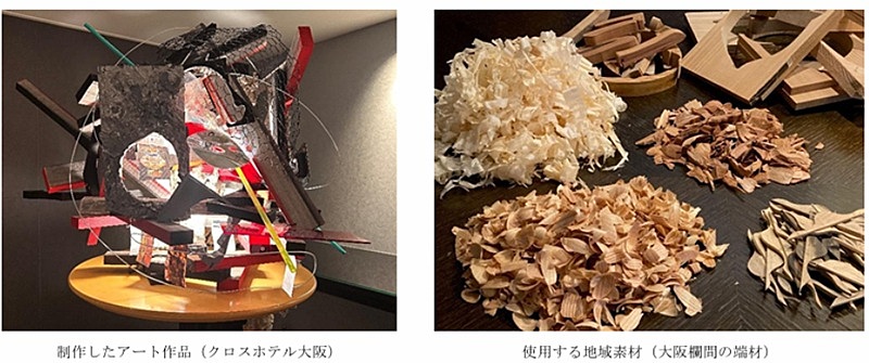 一例として、大阪の「クロスホテル大阪」では、大阪泉州桐箪笥などの製造過程で生じた端材を活用し、高さ約2メートルのインスタレーションを制作。富山県の「黒部・宇奈月温泉やまのは」では、河川や海域の環境管理の過程で回収された流木やウニ殻などの自然素材を活用した。アート作品の制作には、約500名のアーティストのネットワークを持つACTA PLUS社が協力した。