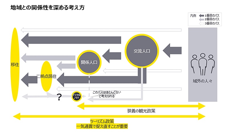 そのうえで、自治体では二拠点居住や移住の政策を実施する部署と交流人口や関係人口の増加を促進する部署とは異なるケースが多いことを指摘。「移住や二拠点居住をそれぞれバラバラに考えるのではなく、ツーリズム政策として一気通貫に考え、政策検討、施策を実行していく必要性がある」と提言した。