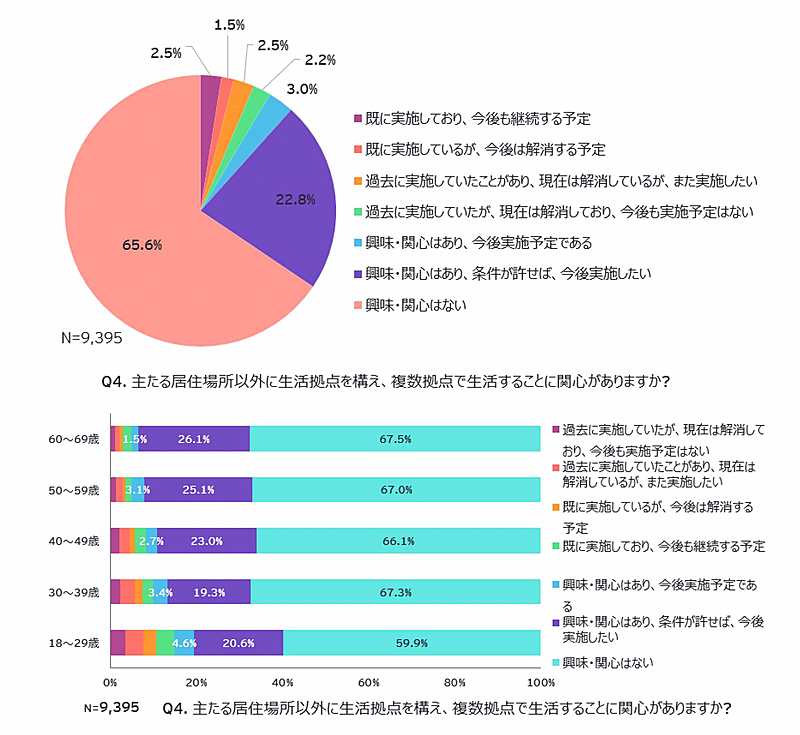 また、年収が高い層ほど二拠点居住者への関心は高く、年代別に見ると、18~29歳では実施経験の割合が高く、「今後実施予定である」の割合は4.6%で世代別で最も高くなった。