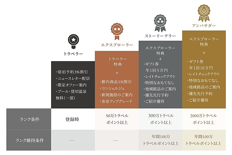 同社が運営する宿泊施設、レストラン、オンラインストアを横断して利用できる生涯累計型のロイヤリティメンバーシップ制度で、1円につき1ポイント付与。顧客の囲い込みを図るとともに、特別イベントを会員限定で提供するなど地域の価値と旅行者をつなぐ取り組みにも力を入れる。
