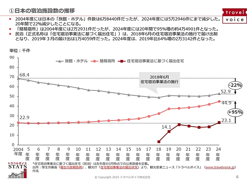 日本の宿泊施設数の推移については、2004年度に6万8440件だった日本の「旅館・ホテル」が、2024年度には5万2946件までに減少した。20年間で22%減少したことになる。一方で、民泊やホステルなどが含まれる「簡易宿所」は20年間で95%増の4万4901件となった。