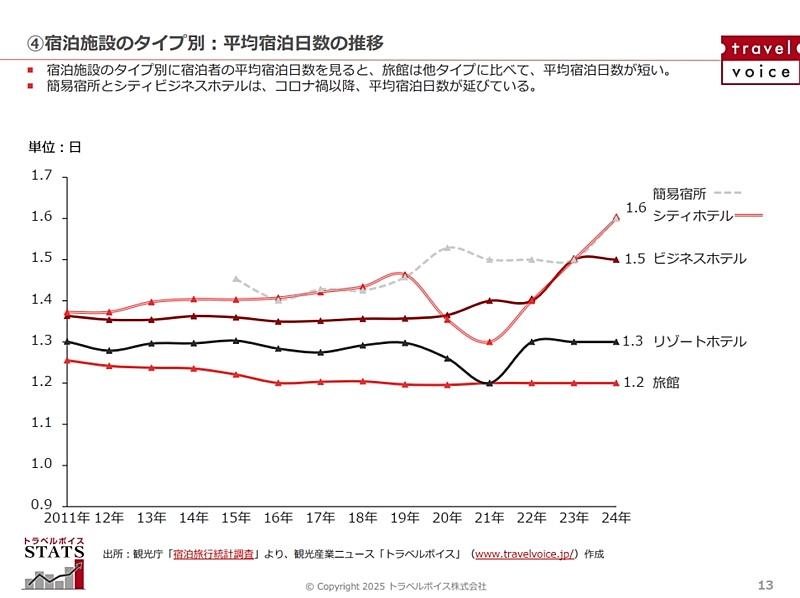 また、延べ宿泊者数の割合の推移をみると、旅館が年々減少しており、ビジネスホテルが増えている。平均宿泊日数も旅館が1.2泊と少ない一方で、簡易宿泊所とシティホテルが1.6泊、ビジネスホテルが1.5泊と、コロナ禍以降の伸びが顕著にみられ、訪日外国人の宿泊者数の増加が影響していると考えられる。もっとも、日本の宿泊施設の定員稼働率は39%(2024年度)にとどまっている。内訳をみると、ビジネスホテルが60%、シティホテルが59%に上っているのに対し、簡易宿所は17%、旅館は21%と低い。