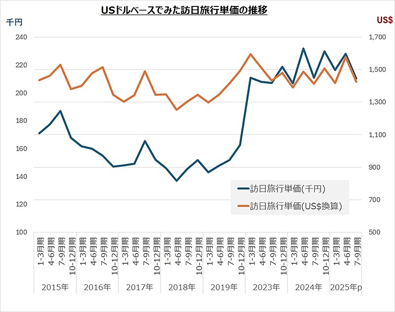 その要因の一つは前述の為替レートの変動で、実はUSドル換算の訪日旅行単価は、この10年間でみると1400ドル前後にほとんど収まっています(図)。