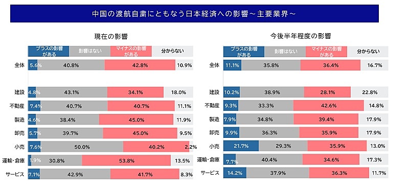 個別には、飲食店から「日本人などで代替できない部分があり、客数減少の影響がある」、不動産業からは「観光、小売店へのマイナス影響が出る」といった観光関連への懸念が多く寄せられた。精密機械や医療機器製造では、ビジネス渡航への影響や、日本側からの渡航抑制を危惧する声もあった。一方で、情報サービス業からは「オーバーツーリズムの改善や国内ビジネス活動の宿泊・移動にプラス」といった、観光地の混雑緩和による好影響を期待する意見もみられた。