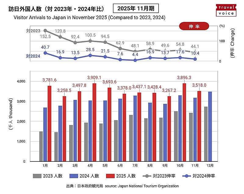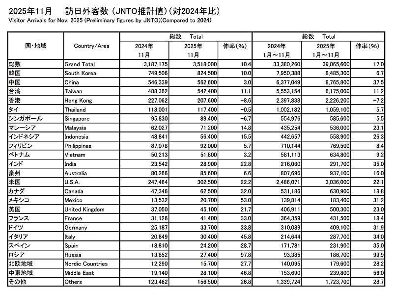 日本政府観光局(JNTO)によると、2025年11月の訪日外国人旅行者数(推計値)は前年比10.4%増の351万8000人となった。1月~11月の累計では17%増の3906万5600人。2024年に過去最多を記録した年間累計の3687万人を、11月時点で200万人以上、上回り、年間の過去最多を更新した。