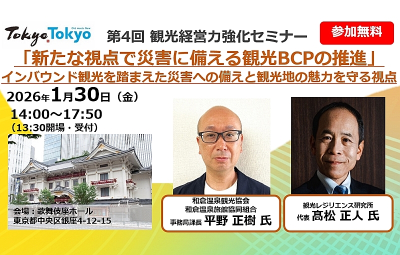 東京都と東京観光財団(TCVB)は2026年1月30日、「第4回観光経営力強化セミナー」を開催する。今回のテーマは「新たな視点で災害に備える観光BCPの推進」。JNTOによると、2025年の訪日外客数は10月時点で3500万人を超え、観光地における危機管理の重要性が一層高まっている。