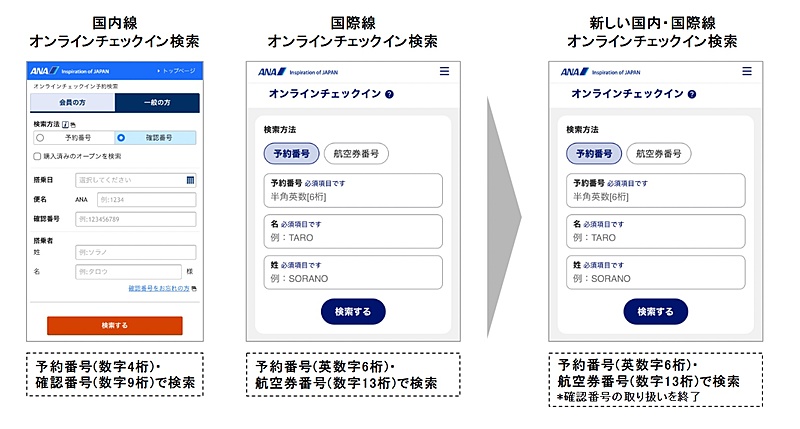 オンラインチェックインでは、システム統合によって、国際線・国内線いずれの予約でも、同じ画面と操作で利用することが可能になる。AIRDO、ソラシドエア、スターフライヤー、IBEXエアラインズ、オリエンタルエアブリッジの提携航空会社とのコードシェア便については、国際線と同様に、運航会社のウェブサイトから実施する方法へ変わる。
