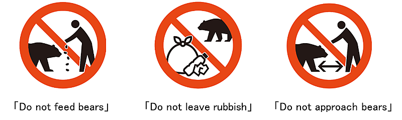 観光庁は、クマ対策として登山客などに守ってもらいたい行動の「観光ピクトグラム」を新たに作成した。「クマへの餌やり禁止」「ゴミ放置禁止」「クマに接近しない」の3つの行動をピクトグラムにした。