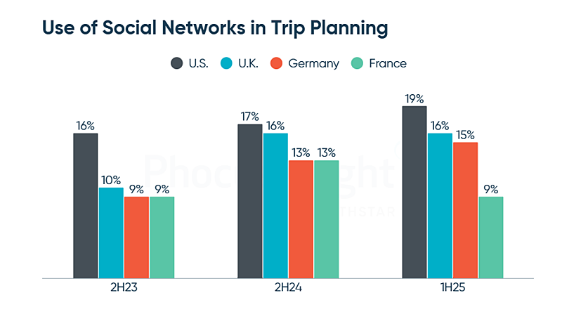 米国では、旅行プランニングでのソーシャルネットワーク利用率は上昇しており、2023年下期の16%から2025年上期は19%へ。同様に、英国では10%から16%、ドイツでは9%から15%とプラス基調で推移している。