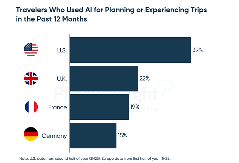 2025年下期の調査では、米国のアクティブ旅行者層の半分以上(58%)が、AIを何かしらの用事で利用しており、旅行のプランニングや体験でのAI利用も同39%を占めた。チャットGPT、グーグルのGemini、そのほかのAI搭載検索エンジンを使っている。欧州に関する同年上期の調査では、英国では22%、フランスでは19%、ドイツでは15%の旅行者がAIを利用しているとの結果だ。